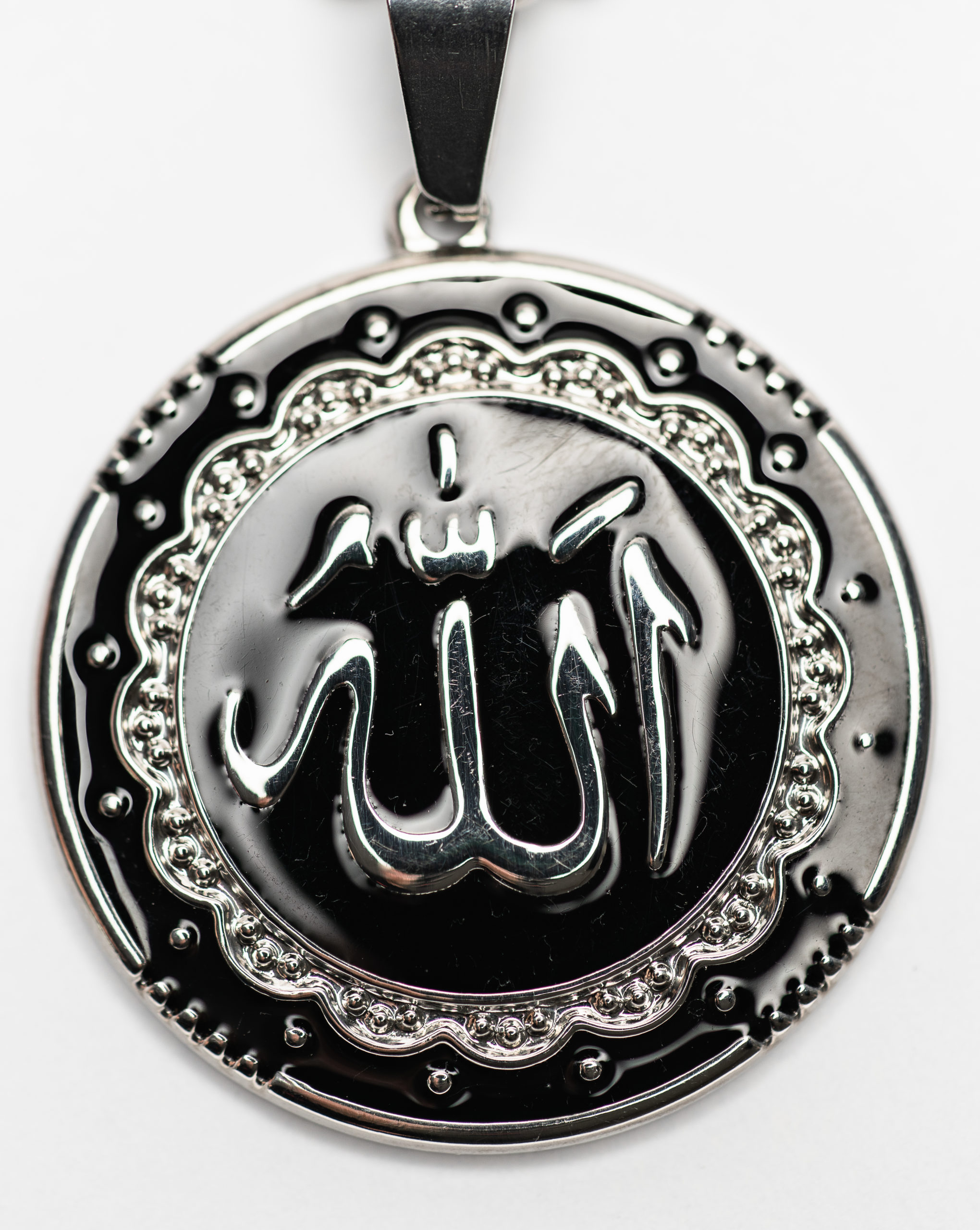 Silver-embossed "Allah" inlaid in black background with artwork. Approx. 1.25" in diameter. Includes 23" chain (appearance of chain may vary).
