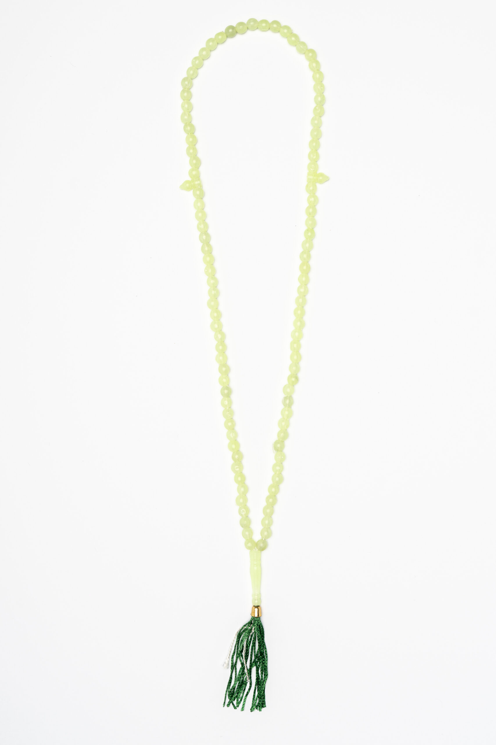 Semi-transparent 99-count green prayer beads with solid green tassel and markers at 33-bead intervals. Beads are approx. 23” in circumference, tassel holder and tassel are approx. 4” in length.
